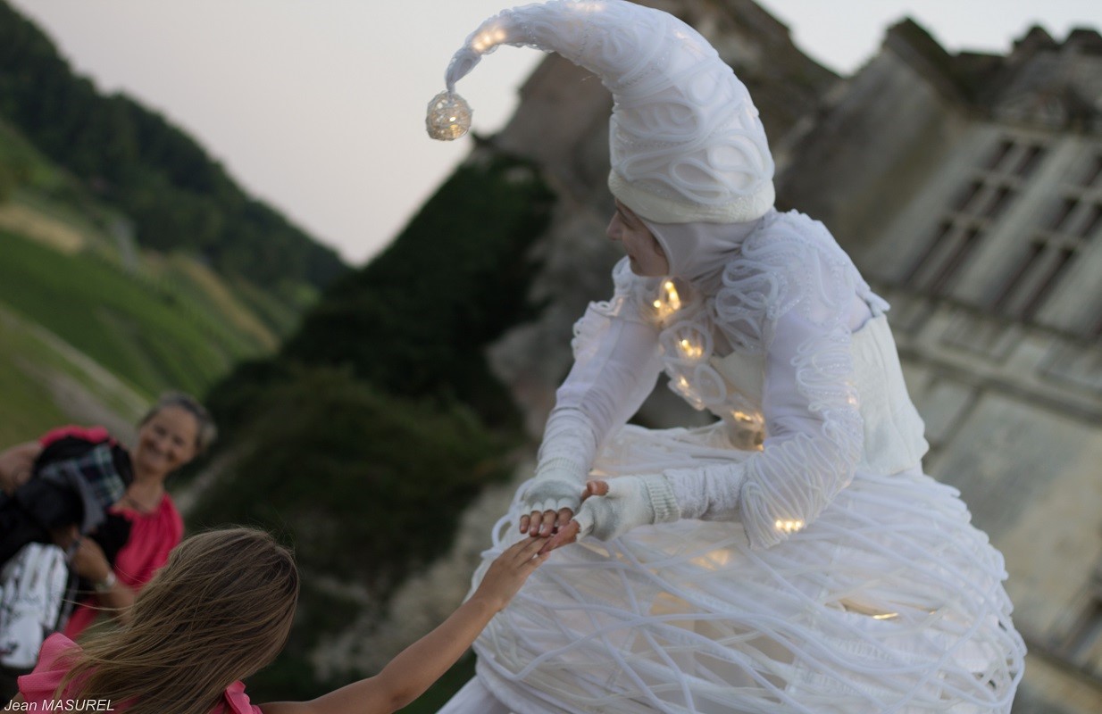 Dans les rues, apparaissent deux échassiers lumineux, Anges tout de blanc vêtus, baignés de lumière et portés par une bulle musicale envoûtante. Ils ne parlent pas, mais leur présence seule suffit à émouvoir. Chaque geste, chaque regard est empreint de bienveillance. Leur démarche est lente, aérienne, presque irréelle. Ils vont à la rencontre du public avec une douceur infinie, offrant sourires et attentions comme des éclats de poésie. Avec eux, le temps ralentit. Un ange passe… et avec lui, un souffle d’éternité.