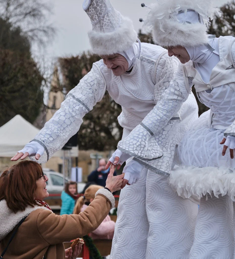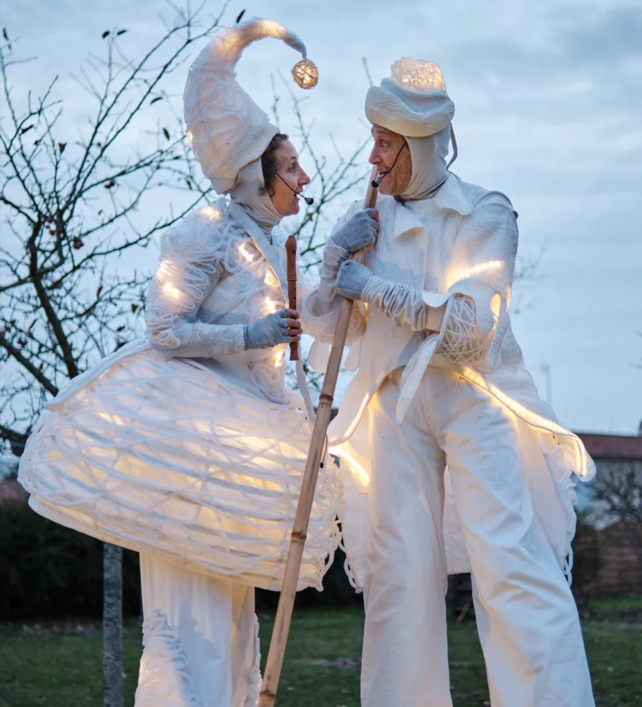 Dans les rues, apparaissent de grands êtres lumineux, Anges tout de blanc vêtus, baignés de lumière et portés par une bulle musicale envoûtante. Ils ne parlent pas, mais leur présence seule suffit à émouvoir. Chaque geste, chaque regard est empreint de bienveillance. Leur démarche est lente, aérienne, presque irréelle. Ils vont à la rencontre du public avec une douceur infinie, offrant sourires et attentions comme des éclats de poésie. Avec eux, le temps ralentit. Un ange passe… et avec lui, un souffle d’éternité.